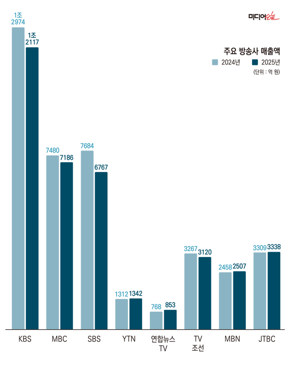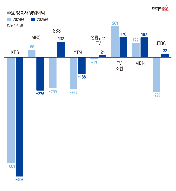 JTBC도 2023년(-584억 원)과 2024년(-287억 원) 영업손실을 기록했는데, 지난해엔 32억 원의 영업이익을 냈다. 다만 지난 2월 열린 밀라노 코르티나 동계올림픽 중계권과 오는 6월 예정된 북중미월드컵 중계권 손실이 반영되고, 광고 판매 수익이 저조할 경우 2026년 실적은 전례없는 위기 상황에 놓일 가능성도 있다. JTBC는 중계권 재판매를 위해 지상파 방송사들과 협상을 이어가고 있지만 현재까지 결과가 나오지 않고 있다.