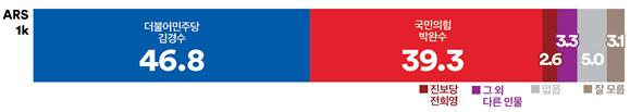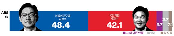 김경수 후보는 권역별로는 2권역(김해시, 양산시)에서 60.1%의 높은 지지율로 박완수 후보(29.9%)에 우세했고, 1권역(창원시 ) 에서도 47.5%로 박완수 후보 40.4%를 따돌렸다.