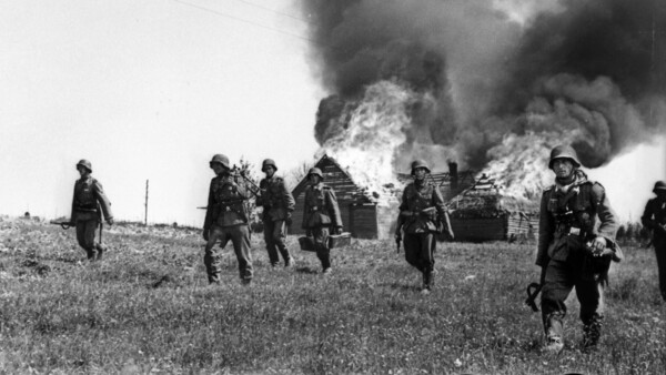 러시아 땅을 우수 민족 독일의 "생활 공간"으로 만들어 그곳의 열등 민족을 다스리면 인류 역사가 새롭게 쓰일 것이라는 히틀러의 망상으로 동부 전선에서 독일군은 사람들을 살육하고 집을 불태웠다. (Publid Domain)