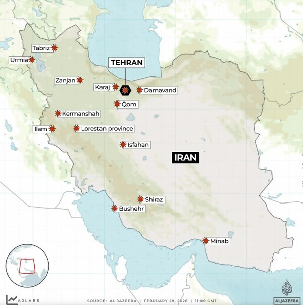 공격 첫 날인 2월 28일, 폭격을 당한 이란의 도시들이다. 트럼프는 미국과 이스라엘의 합동 폭격으로 이란을 무릎 꿇릴 것을 자신했지만 예상은 빗나갔다. 그는 이란을 "석기 시대로 돌리겠다"고 극언에 가까운 경고를 날렸지만 이란은 아직 전쟁을 포기할 태세가 아니다. (알자지라)