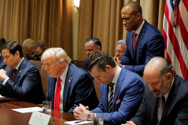도널드 트림프 미국 대통령과 각료들이 지난해 3월 26일(현지시간) 제2기 첫 백악관 각료 회의를 시작하기 전 기도를 올리고 있다. 그는 최근 이란과의 전쟁을 시작하고 자신을 구원자로 제시하는 이미지를 SNS에 올리기도 했다. 이 전쟁을 성전화하려는 의도가 읽힌다. 2025.3.26 연합뉴스 자료사진