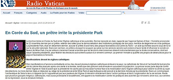 박창신 신부에 대한 종북몰이를 시작으로 한국의 가톨릭에 대한 박근혜 정권과 이에 충동된 보수세력들의 가톨릭과 성당에 대한 위협이 계속되고 있는 가운데 드디어 교황과 교황청의 공식 라디오인 ‘바티칸 라디오 방송(Radio Vatican)’이 이에 대한 우려의 목소리를 내고 나섰다. "세계와 대화하는 교황과 교회의 목소리"라는 타이틀로 바티칸의 공식 라디오인 ‘바티칸 라디오’는 29일 송출된 방송에서 전날 파리 해외선교 소식통신(Agence d’information des missions etrangeres de Paris)인 아시아교회 통신(EDA, Eglises d'Asie)이 전한 기사를 바탕으로 한국에서 가톨릭교회와 정부와의 사이가 험악하다고 보도했다.