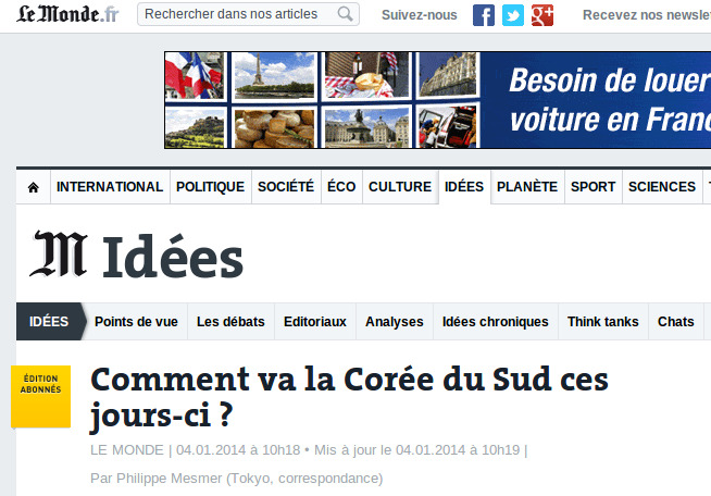 르몽드와 렉스프레스의 한국 담당기자인 메스메르 기자가 쓴 ‘Comment va la Coree du Sud ces jours-ci ?-요즘 한국은 안녕하십니까?’라는 제목의 이 기사는 “요즘 안녕들 하십니까?” 2013년 12월 경제학과 대학생 주현우씨가 고려대 게시판에 써 붙인 대자보 - 모택동 시절 중국에서 벽에 써 붙이던 신문과 같은 방식으로, 1980년대에 독재 반대세력들이 이용하던 손으로 쓴 벽보 -의 첫머리에 이 문구를 써 넣은 이후, 이 질문은 한국사회를 흔들고 있다’고 기사를 시작하며 ‘주씨의 자발적인 행동이 일으킨 반향은 박근혜의 사퇴를 요구하며 한 남자가 분신[死]할 정도로 지속되고 있는 불안을 증명해 준다. 그의 피켓은[유서는] “요즘 안녕들 하십니까 ?”라는 문구를 인용하고 있었다’고 이남종 열사의 분신항거도 전하고 있다.