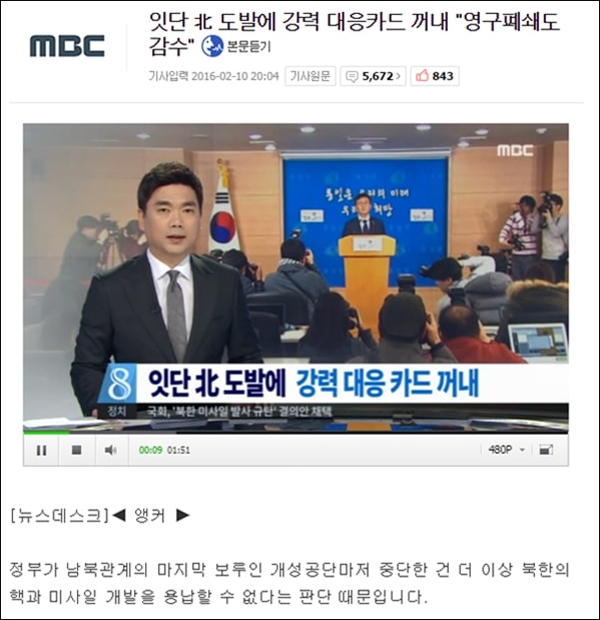 ▲개성공단 폐쇄를 보도한 MBC뉴스 ⓒ MBC뉴스 화면 갈무리