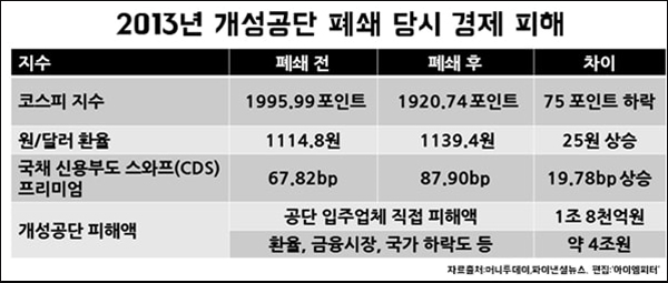 2013년 파이낸셜 뉴스는 개성공단 입주업체의 직접적인 피해액은 1조 8천억 원이었고, 환율이나 금융시장, 국가 하락도 등으로 약 4조 원의 피해가 발생했다고 보도했습니다.