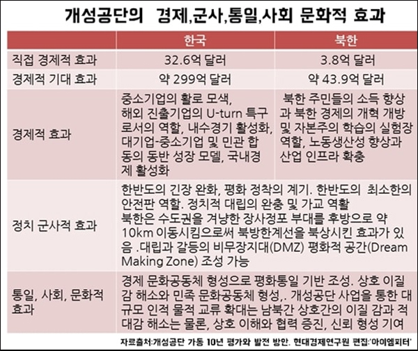 현대경제연구원에 따르면 지난 10년간 개성공단은 남한에는 32.6억 달러의 내수 진작 효과를, 북한에는 3.8억 달러의 외화 수입을 가져다준 것으로 추정됩니다. ‘개성공단 가동 10년 평가와 발전 방안’을 보면 만약 총 3단계의 개성공단 개발이 완공될 경우에는 남북한은 총 686.7억 달러의 경제 효과가 나타난다고 전망하고 있습니다.