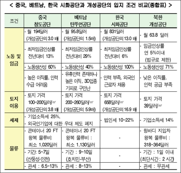 ▲개성공단의 경제적 이점과 활용 방안 보고서에 나온 중국, 베트남, 한국 공단과 개성공단 비교 ⓒ현대경제연구원