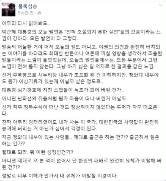 ▲물뚝심송이 페이스북에 쓴 박근혜 대통령 발언 관련 글 ⓒ페이스북화면갈무리