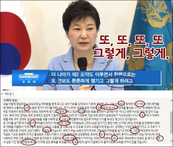박근혜 대통령이 언론사 편집·보도국장 오찬간담회에서 했던 모두 발언을 보면 ‘또’, ‘그렇게’, ‘그런’, ‘이런’이라는 모호한 단어가 많이 등장합니다. 단어를 중복해서 쓰기도 합니다. 예를 들어 ‘오늘 함께하신 자리’라고 해도 됐을 말을 ‘오늘 이 자리가 함께하신 이 자리가’처럼 말을 하기도 합니다.