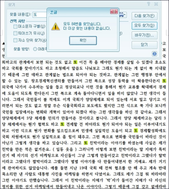 ▲ 박 대통령과 언론사 편집·보도국장의 비공개 질의응답 전문에서 박 대통령의 발언 중 ‘또’라는 단어를 검색한 결과