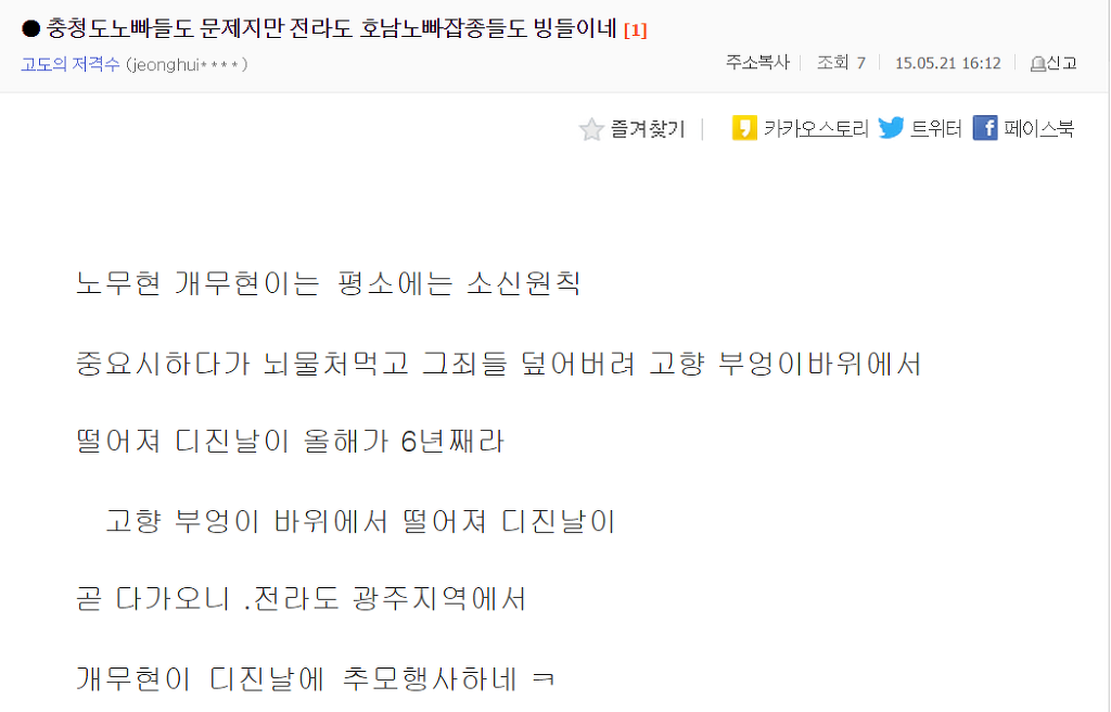 타살이라고 사기까지쳐서 찬양질하지 ㅋㅋㅋ니네 개상도친노들위해서 ㅁ