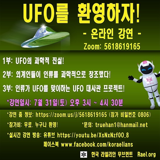 이처럼 국내외에 걸쳐 갈수록 UFO 출현 사례가 급증하고 이에 대한 관심이 고조되는 가운데, 한국 라엘리안 무브먼트(대표 정윤표)가 오는 7월 31일(토) 오후 3시부터 4시 30분까지 ‘UFO를 환영하자’는 주제로 UFO에 대한 대중의 호기심을 풀어주는 온라인 강연회를 진행한다.