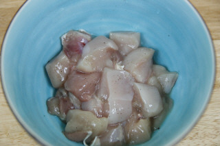 닭가슴살은 한 입 크기로 썬 다음 청주. 소금. 후추를 넣고 20여분 정도 잽니다.
